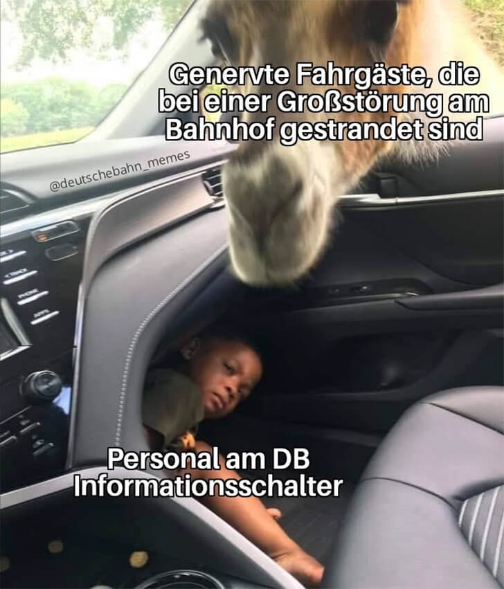Digga, dieses Meme ist so deutsch, es könnte Bratwurst schwitzen! Jeder, der schon mal mit der Bahn gefahren ist, fühlt dieses Bild in seiner Seele. Das Kamel-Face ist literally jeder von uns, wenn die Anzeigetafel nur noch rot blinkt. Und der arme Typ am Infoschalter? Alter, der kämpft gegen eine Kamel-Armee und ist der wahre Unsung Hero in diesem DB-Drama.