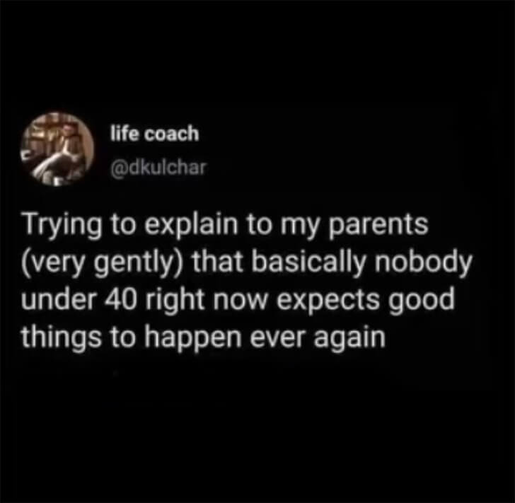 Uff, das trifft härter als der Blick unserer Oma, wenn wir ihr sagen, dass wir immer noch keinen festen Job haben. Dieser Tweet ist quasi das Generationen-Ghosting in Reinform. Während unsere Eltern noch von der nächsten Mallorca-Reise träumen, planen wir schon unseren Umzug in einen Bunker. Es ist, als würden wir versuchen, einem Internet-Explorer zu erklären, warum TikTok cool ist.